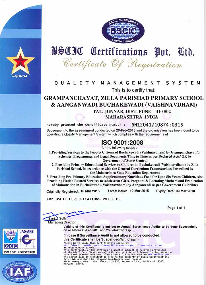 - Gram Panchayat, School & Anganwadi got ISO certification – ISO 9001:2008 .