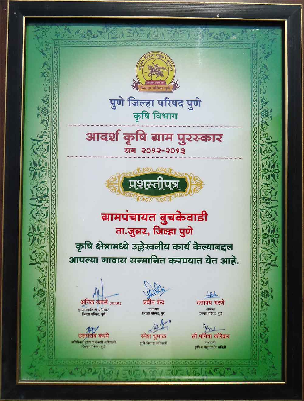 - District level first prize of "Model Agriculture Village Award" awarded by Zilha Parishad for the year – 2012-13.