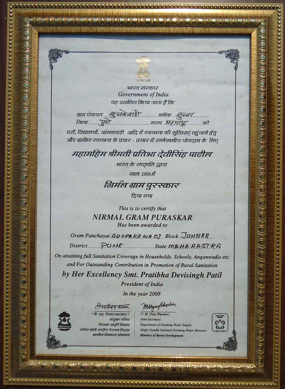 - Nirmal Gram Puraskar from Government of India in the year 2008.